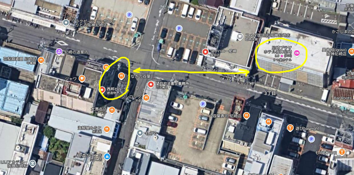 結論から言えば、第一に驚いたのはこのホテルの場所はZ3が経営していた兵庫県尼崎市にある「あすと法務事務所」の目の前に移動していた。歩いて1分もかからない場所である。距離にすれば20mから30mしか離れていない。