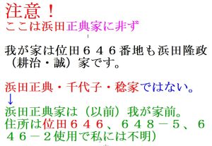 同時に、Z家(浜田稔・千代子・正典家)が何故、我が家の住所番地を70年使用したのかという謎がある。更に、私への危害の大半はZ家のZ3と私との人間違いが随時臭わされている。(亡き友人は2012年に明言をしてもいた)。