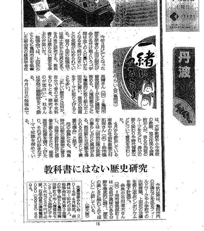 勉強会では、上田氏らとともに亀岡市史を執筆した副会長の経済学者杜晃精さん (69) 亀岡市曽我部町が主に講師を務める。人権問題などにも積極的に取り組んだ上田氏に習い、差別の問題をテーマに取り上げることも多い。》