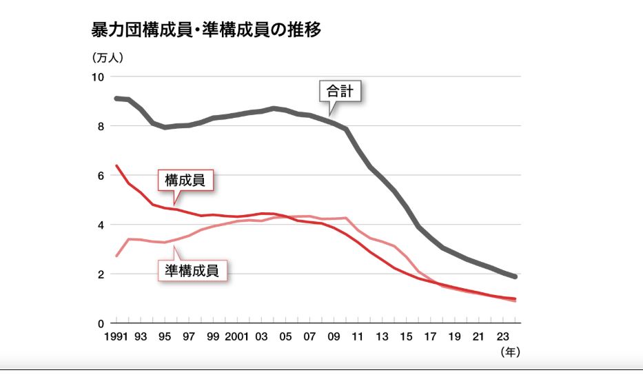 【図表-13・暴力団構成員の推移。私はこの問題には絡められていないと思っていたが。私に分からぬように工作をしていたならば知らぬが、そうでなければ、私以外の人の力か世の流れであろう】
