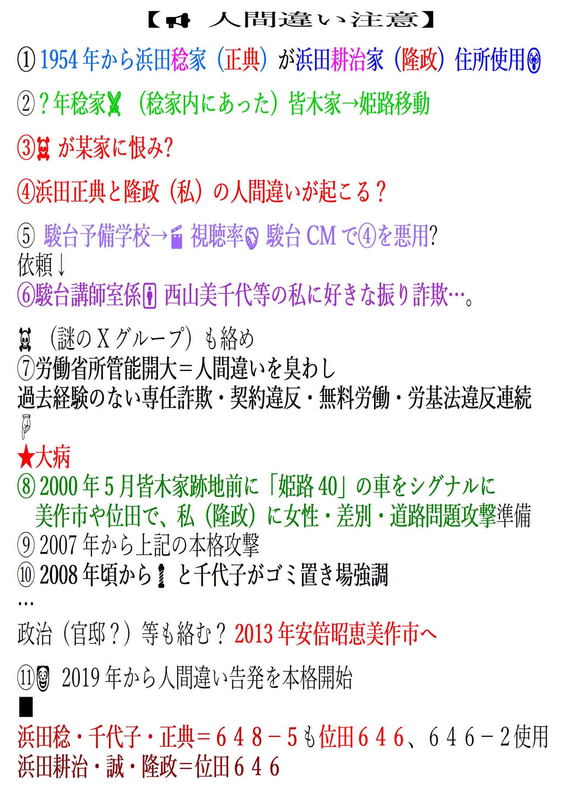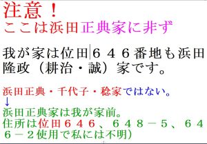 同時に、Z家(浜田稔・千代子・正典家)が何故、我が家の住所番地を70年使用したのかという謎がある。更に、私への危害の大半はZ家のZ3と私との人間違いが随時臭わされている。(亡き友人は2012年に明言をしてもいた)。
