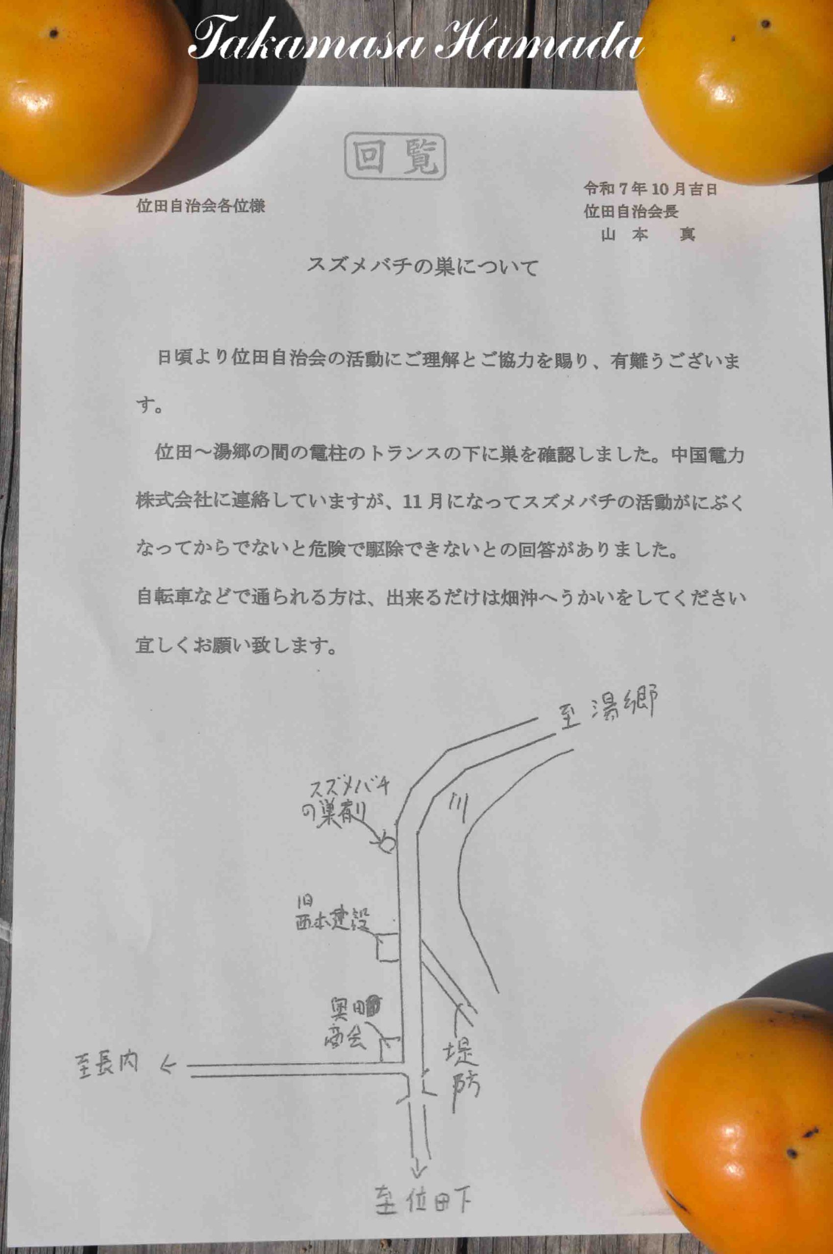 なお、昨日(2025/10/23)の回覧板では(岡山県美作市)位田側はスズメバチが出て危険なので、自転車の人は畑沖(はとおき)側を通るように指示が出されていた。
