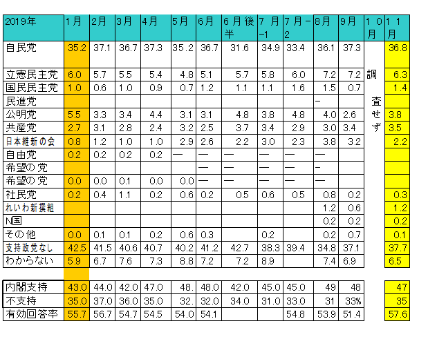| Memo-A-1:世の動き | 19-302-3🆗🆖【#安倍内閣支持率】 #NHK 11/8-10調査 支持率 47%(前回比-1%) 不支持35%(+2%) ▽ 📣特徴→10月調査なし。20年で始めて。 ▽ 俗に言う #一党制 はいつからか。 #2012年 が本質である。 拙著「日本のフィクサーME・パート2」で追々語ろう。 ▽ ↓政党支持率https://pbs.twimg.com/media/EJQiL3UUcAAJ38i?format=png&name=small |