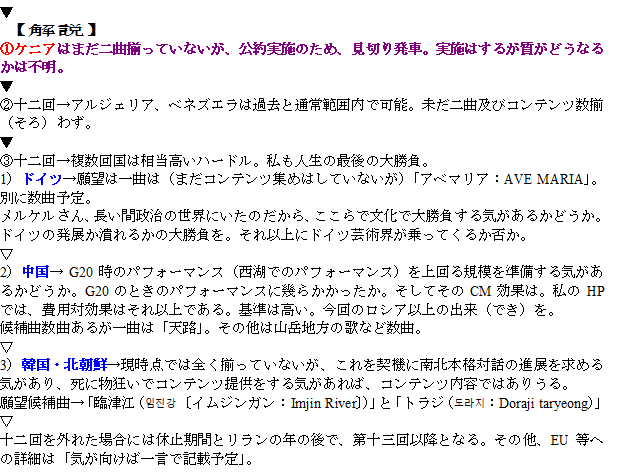 Memo-1・ | 19-208-2【🎼世界の歌】予定 第十回🇻🇳ベトナム 第十一回🇰🇪ケニア Kenya 第十二回未定→候補🇩🇪🇨🇳🇪🇺、🇦🇷🇻🇪、その他 検討枠内🇰🇵🇰🇷 ▽ その後、第一回~十二回の要約型リラン(再演)。 上記後から第十三回以降開始予定 ▽ ただし、第九回ロシア終了後、HPリフォームで2か月+αは休止予定https://pbs.twimg.com/media/EBL6Dx6U4AApkR6?format=png&name=small |
