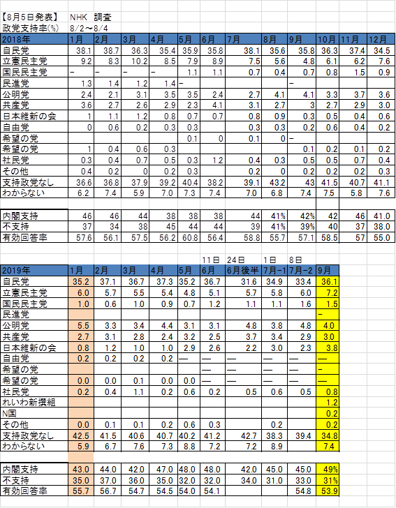 Memo-A-1:世の動き | 19-208-3🆗🆖【#安倍内閣支持率】#NHK 8/5 安倍内閣支持率 49%(先月比 +4%) 不支持 31%(-2) ▼ ☆#北朝鮮ミサイル 7月25日ミサイル2発 7月31日飛しょう体2発 8月2日ミサイル2発 ☆2019年7月←戦後最悪の #日韓関係 ■ 政党支持率↓https://pbs.twimg.com/media/EBNdTwLU8AAkVmq?format=png&name=900×900 |