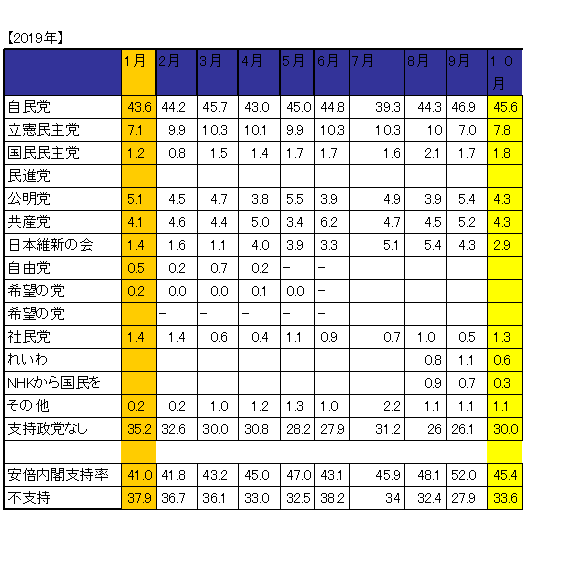 Memo-A-2:世の動き | 19-283-3🆗🆖【#安倍内閣支持率】 #ANN 10/19-20 支持 45.4%(-6.6) 不支持 33.6%(+5.7) □ 特徴→ ①#ナショナリズム ごく少し沈下 ②#消費税 引き上げ後 ③#天皇即位の礼 の前の調査 ▼ ↓#政党支持率https://pbs.twimg.com/media/EHjJe3PU0AE-UoY?format=png&name=small |